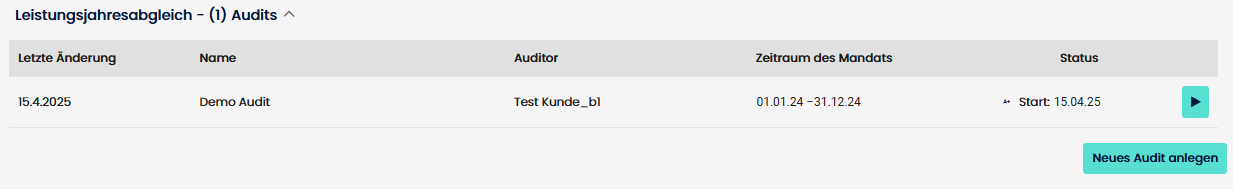 - Bei laufenden Audits: "Play"-Icon-Button – öffnet die Audit-Detailansicht (nur bei vorhandenen Zugriffsrechten)