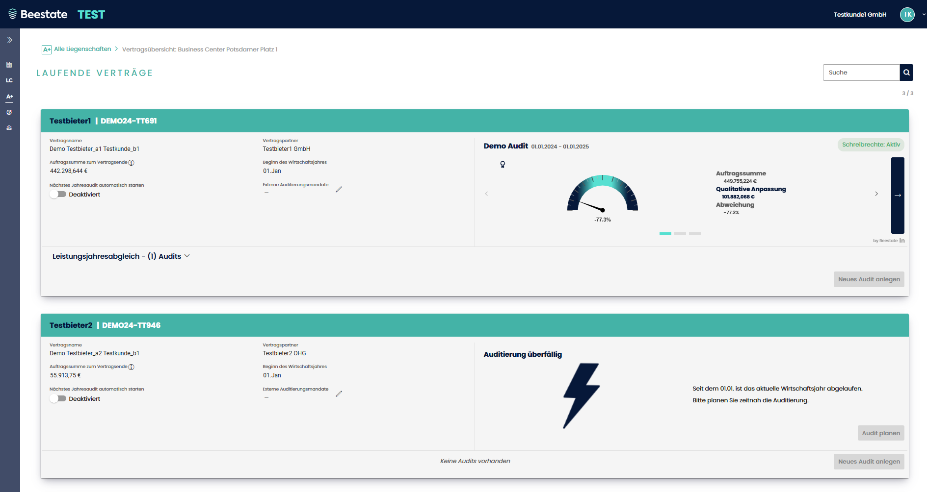 Jede Vertragskarte zeigt Ihnen alle relevanten Vertragsinformationen sowie den aktuellen Audit-Status auf einen Blick.