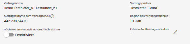 | Auftragssumme zum Vertragsende | Die festgelegte Gesamtsumme des Leistungsverzeichnisses. Über das Info-Icon erhalten Sie weitere Details zur Berechnung. |