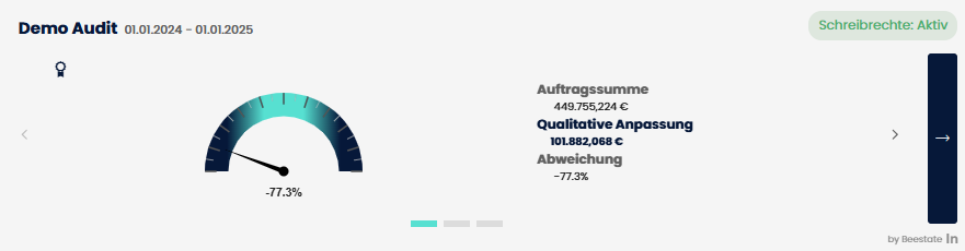 - Kennzahlen-Karussell: Drei navigierbare Ansichten zeigen die aktuellen Anpassungswerte: