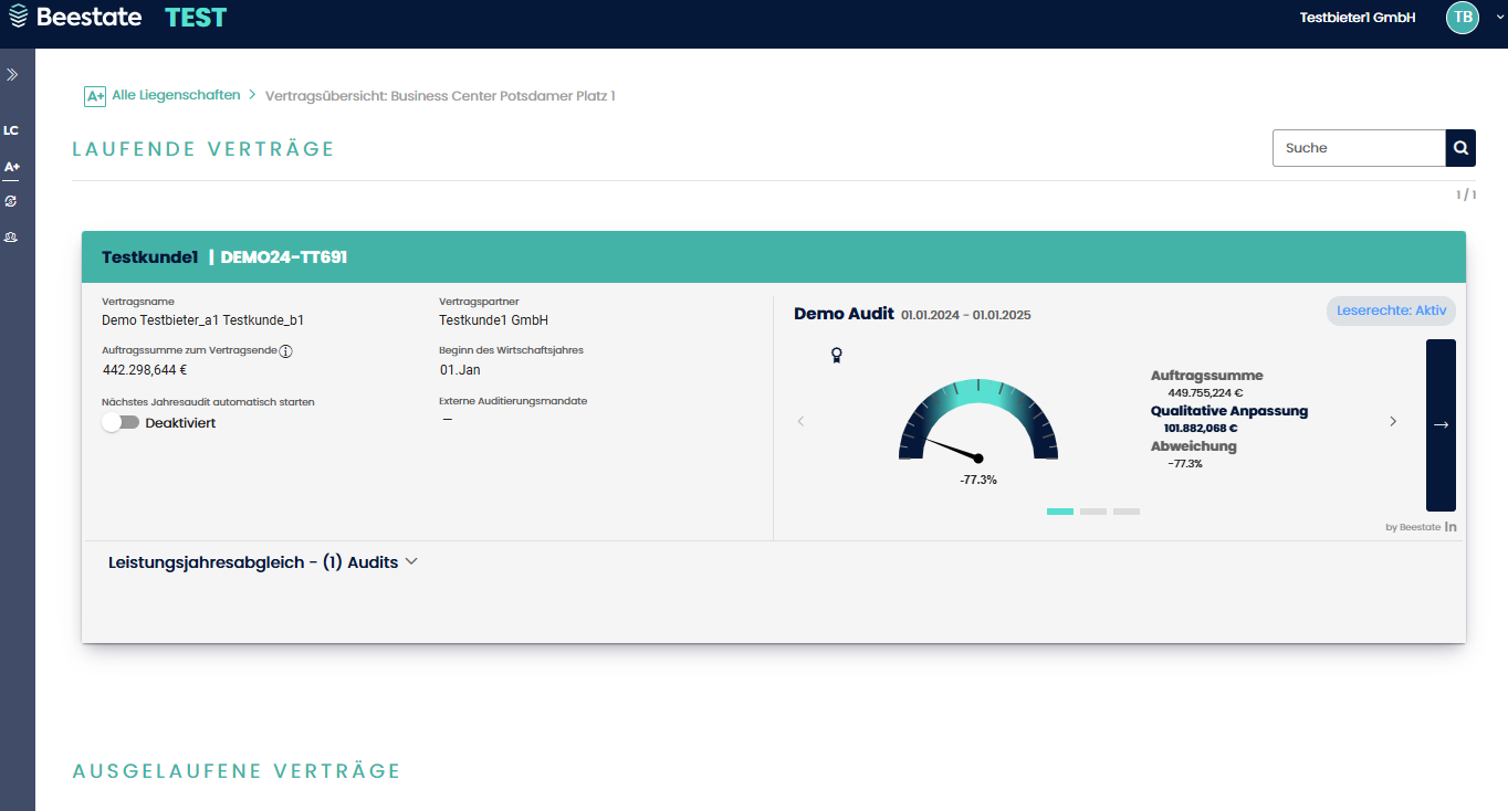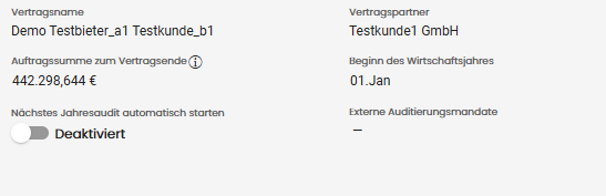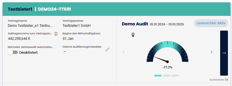 Jede Vertragskarte zeigt Ihnen die relevanten Vertragsinformationen sowie den aktuellen Audit-Status.