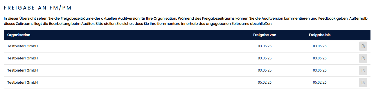 Ihr Zugriffsrecht wird vom Auditor gesteuert. Der Lesezugriff wird über die Option "Leserechte FM während Audit" in den Grunddaten aktiviert. Der Schreibzugriff wird automatisch während eines aktiven Freigabezeitraums gewährt.
