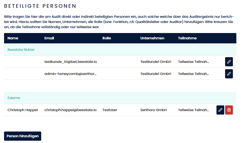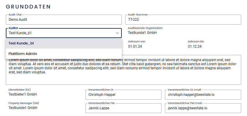 - Freigabeprozess: Externe Audit-Firmen und deren Mitarbeiter müssen zuvor durch Beestate (oder Administratoren) überprüft und freigegeben werden, bevor sie in der Auswahl erscheinen.