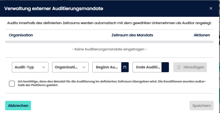 Für die Beauftragung externer Dienstleister nutzt das System "Mandate". Ein Mandat berechtigt eine externe Firma, Audits für einen bestimmten Vertrag in einem definierten Zeitraum durchzuführen.