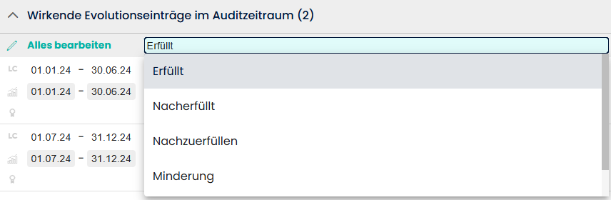 Ziel ist es, am Ende des Audits alle relevanten Evolutionseinträge auf einen der finalen Status (Erfüllt, Nacherfüllt, Minderung) zu setzen.