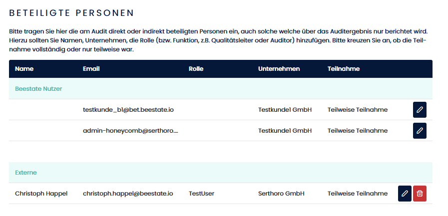 Plattformnutzer, die Änderungen an den Auditdaten vornehmen, werden hier automatisch aufgeführt. Sie können externe Personen zusätzlich (z.B. einen Hausmeister ohne Plattformzugang, der bei einer Begehung anwesend war) manuell hinzufügen, bearbeiten oder löschen, um die Dokumentation zu vervollständigen. Beestate-Plattform-Nutzer die in der "Beteiligte Personen"-Tabelle gelistet sind können nicht gelöscht werden.
