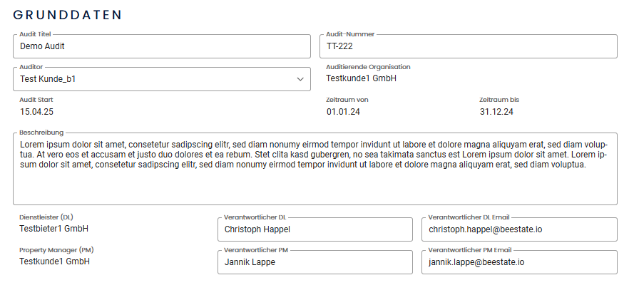 Die Ansicht "Grunddaten" ist eine zentrale Anlaufstelle innerhalb eines jeden Audits. Hier verwalten Sie als Auditor administrative Details, beteiligte Personen und grundlegende Dokumentationen zum Audit-Prozess.