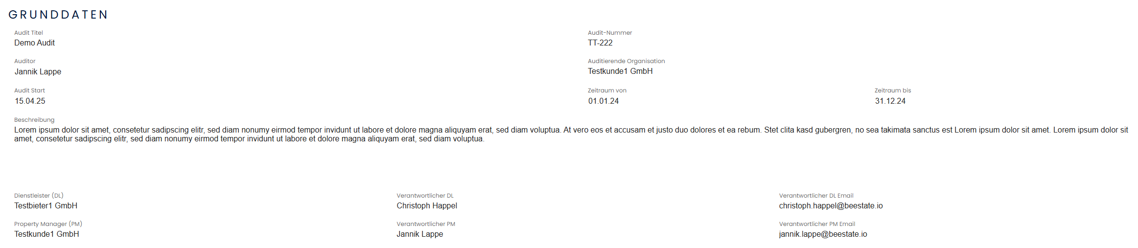 Die Ansicht "Grunddaten" ist eine zentrale Anlaufstelle innerhalb eines jeden Audits. Hier verwalten Sie als Auditor administrative Details, beteiligte Personen und grundlegende Dokumentationen zum Audit-Prozess.