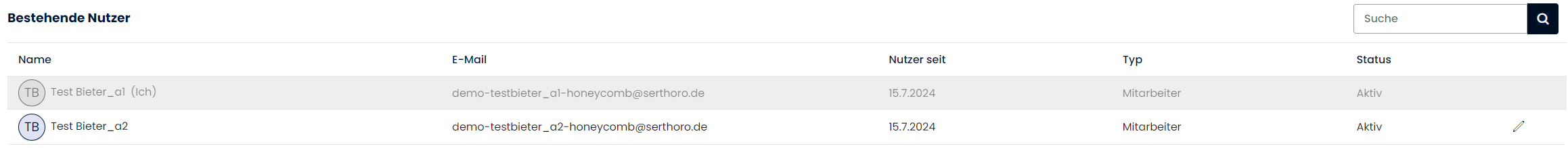 Im Tab „Bestehende Nutzer” finden Sie eine Übersicht aller aktuellen Nutzer, die bereits auf Ihren Unternehmensaccount zugreifen können.