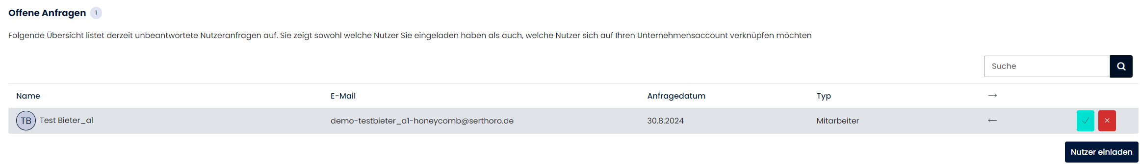 Im Tab „Offene Anfragen” werden alle unbeantworteten Nutzeranfragen angezeigt. Diese Übersicht zeigt sowohl die Nutzer, die Sie eingeladen haben, als auch die Nutzer, die sich auf Ihren Unternehmensaccount verknüpfen möchten.