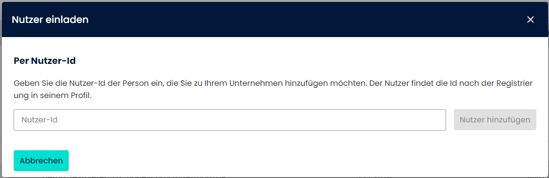 Um einen neuen Nutzer einzuladen, klicken Sie auf den Button „Nutzer einladen”. Es öffnet sich ein Dialogfenster, in dem Sie die Nutzer-ID des neuen Nutzers eingeben können. Die Nutzer-ID wird nach der Registrierung im Profil des Nutzers angezeigt.