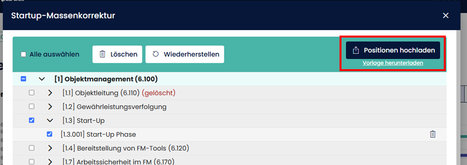 In der LV-Ansicht finden Sie die Option zur Massenkorrektur des LVs. Durch einen Linksklick auf diesen Button öffnet sich ein Dialog, über den Positionen massenhaft gelöscht und hochgeladen werden können.