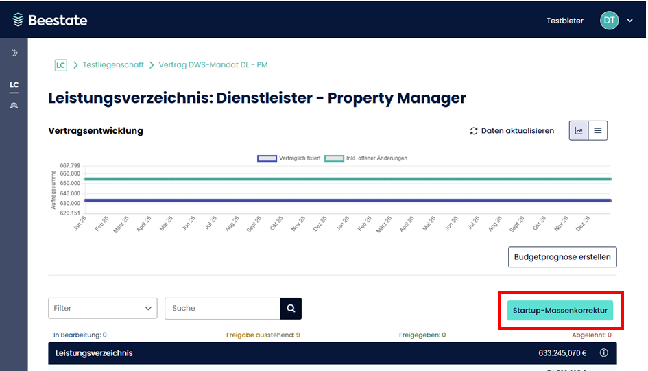 - Nur während der Startup-Phase verfügbar: Die Massenkorrektur des LVs ist nur vor Vertragsstart möglich.