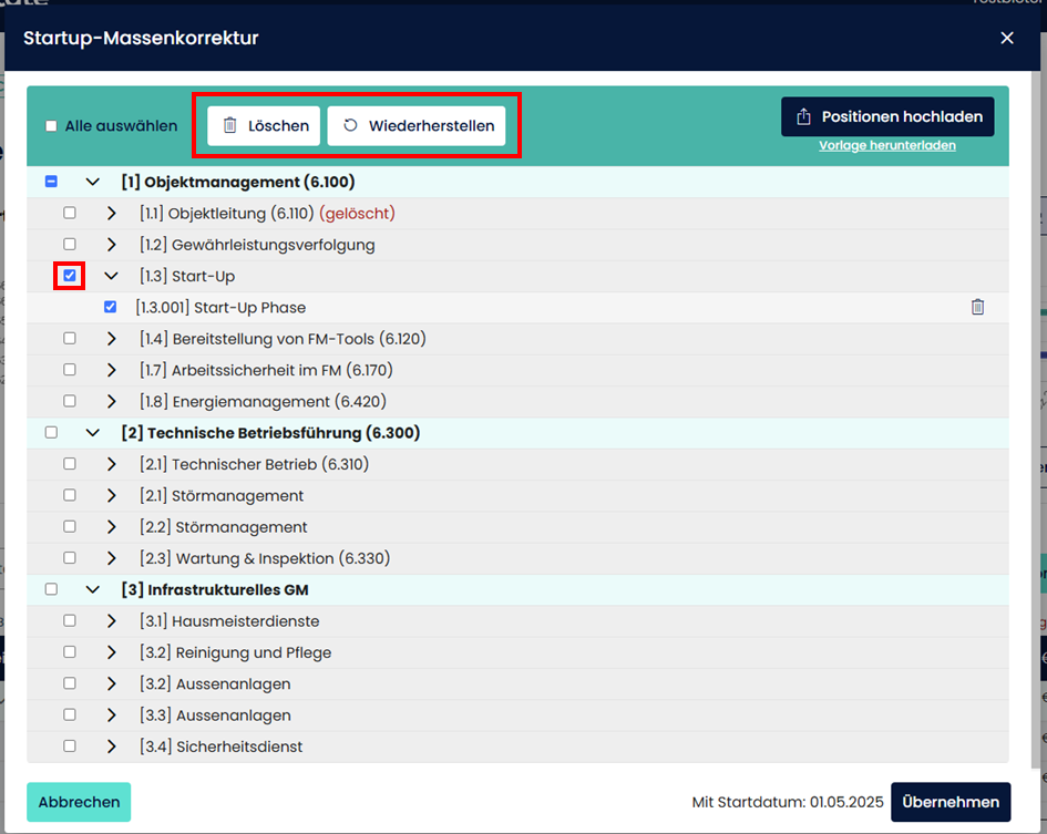Löschen und Wiederherstellen von Positionen: