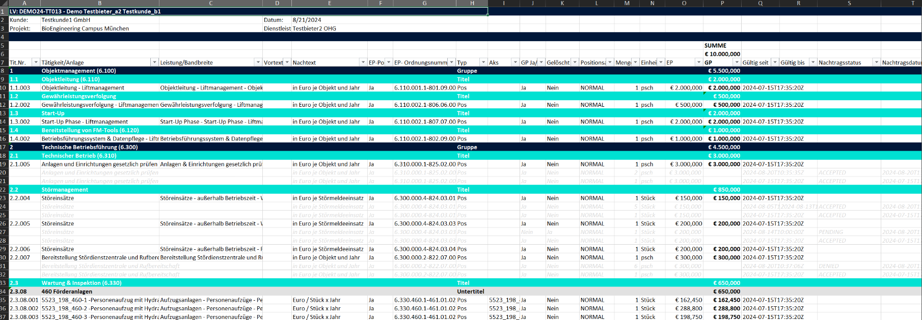 Das exportierte Excel-Dokument ist übersichtlich strukturiert: Links von der Summenspalte finden Sie die standardmäßigen LV-Informationen wie Positionen, Mengen und Preise. Rechts von der Summenspalte sind zusätzliche Informationen zu den Nachträgen aufgeführt, einschließlich Gültigkeitszeiträumen und Nachtragsstatus. Der hierarchische Aufbau ist Analog zur Darstellung auf der Plattform - nach Positionsnummer sortiert. Unterhalb der jeweiligen Position sind die zugehörgien Nachträge aufgelistet. Diese Struktur ermöglicht Ihnen einen schnellen Überblick über alle relevanten Informationen und Änderungen im Leistungsverzeichnis.