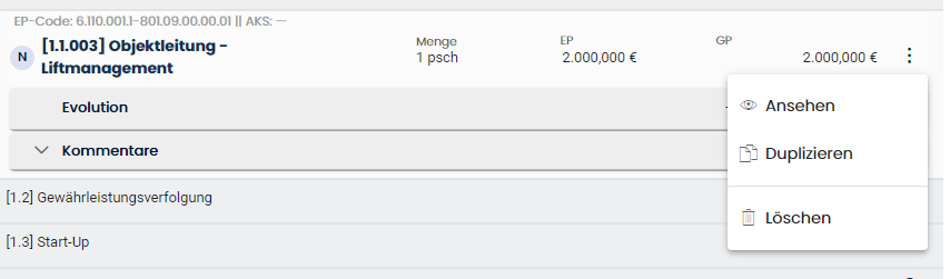 Über das Dreipunktsymbol zur rechten Seite der Position gelangen Sie ins Kontextmenü. Das Menü erlaubt die Position anzusehen, zu duplizieren oder zu löschen.