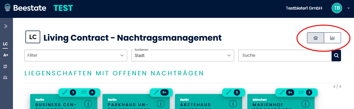 Die Living-Contract-Übersicht in der Beestate-Plattform ist die zentrale Anlaufstelle zur Verwaltung von Verträgen und Nachträgen. Sie bietet zwei Ansichten: eine Liegenschaften-Ansicht (Karten mit Liegenschaften und Vertragsinformationen) und eine Dashboard-Ansicht (Kennzahlen, Diagramme und Tabellen). Beide Ansichten können Sie über einen Umschalter oben rechts auf der Seite wechseln.