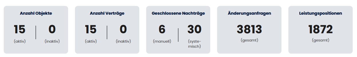 Die Dashboard-Ansicht bietet Kennzahlen, Diagramme und Tabellen zu Objekten, Verträgen, Nachträgen und Handlungsbedarf. Sie eignet sich, um den Gesamtstatus auf einen Blick zu erfassen und gezielt in Verträge mit Handlungsbedarf zu wechseln.