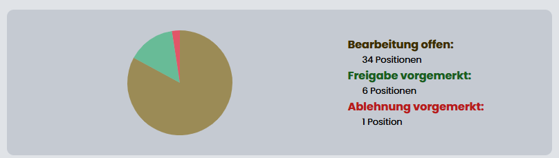 - Grafik und Legende: Eine Grafik (z. B. Kreisdiagramm) mit der Aufteilung in Bearbeitung offen, Freigabe vorgemerkt und Ablehnung vorgemerkt, jeweils mit Anzahl Positionen.