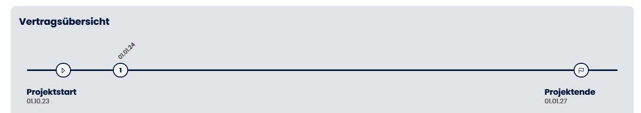 - Timeline: Eine horizontale Zeitleiste mit Projektstart (Play-Icon) und Projektende (Flaggen-Icon) sowie nummerierten Markern für Vertragsstart-Termine. Ein Klick auf einen Marker markiert den zugehörigen Vertrag in der Tabelle und scrollt dorthin.