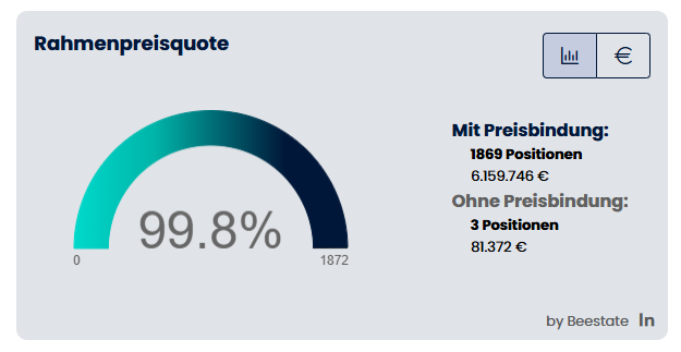 - Rahmenpreisquote: Ein Halbkreisdiagramm zeigt den Anteil der Positionen mit Preisbindung. Über einen Umschalter (Balken-Icon / Euro-Icon) wechseln Sie zwischen Darstellung nach Positionen und nach Beträgen (€). Die Legende listet Mit Preisbindung (Anzahl Positionen und Betrag) und Ohne Preisbindung (Anzahl Positionen und Betrag).