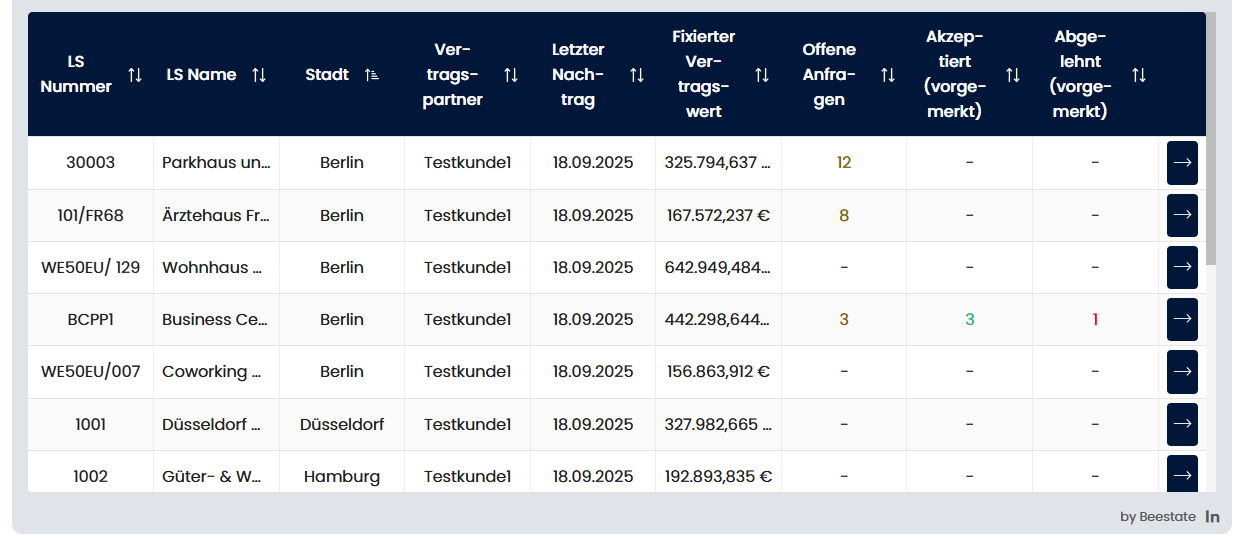 - Tabelle: Spalten LS Nummer, LS Name, Stadt, Vertragspartner, Letzter Nachtrag, Fixierter Vertragswert, Offene Anfragen, Akzeptiert (vorgemerkt), Abgelehnt (vorgemerkt). Der Pfeil-Button am Zeilenende führt zur Vertragsdetailseite. Werte für Offene Anfragen, Akzeptiert und Abgelehnt sind farblich hervorgehoben.
