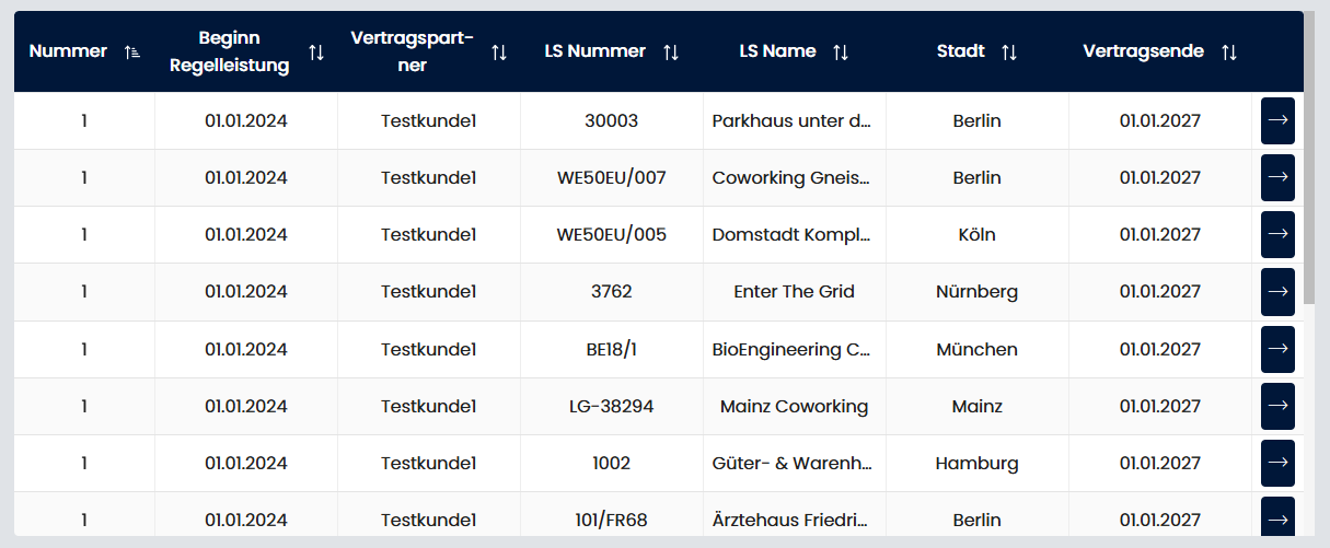 - Tabelle: Spalten Nummer, Beginn Regelleistung, Vertragspartner, LS Nummer, LS Name, Stadt, Vertragsende. Am Zeilenende ein Pfeil-Button zum Öffnen der Vertragsdetailseite.