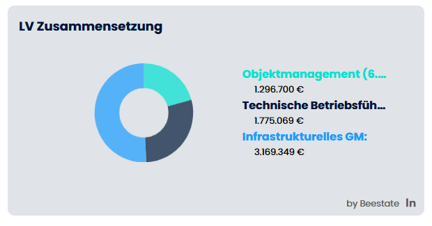 - LV Zusammensetzung: Ein Donut-Diagramm zeigt die Aufteilung der Leistungsverzeichnis-Positionen nach Kategorien (z. B. Objektmanagement, Technische Betriebsführung, Infrastruktur). Die Legende nennt die Kategorietitel und die zugehörigen Beträge in Euro.
