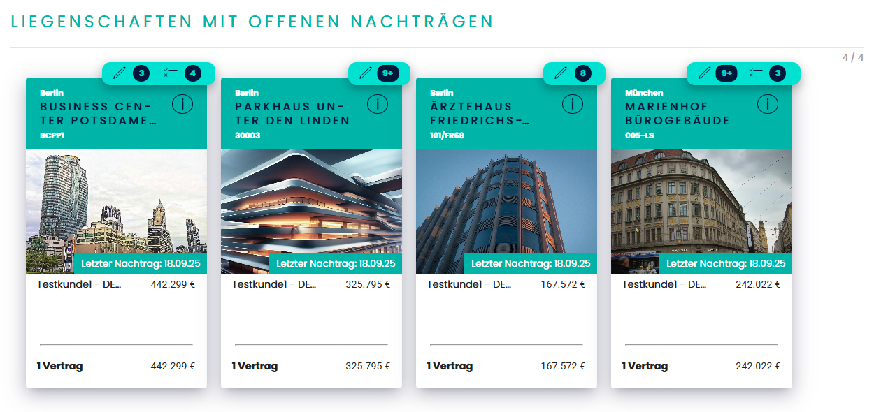 In diesem Abschnitt werden Liegenschaften angezeigt, bei denen noch offene Änderungsanfragen oder vorgemerkte Entscheidungen (Freigabe/Ablehnung) bestehen. Über der Kartenliste wird die Anzahl der sichtbaren Liegenschaften im Verhältnis zur Gesamtanzahl angezeigt (z. B. 4/4).