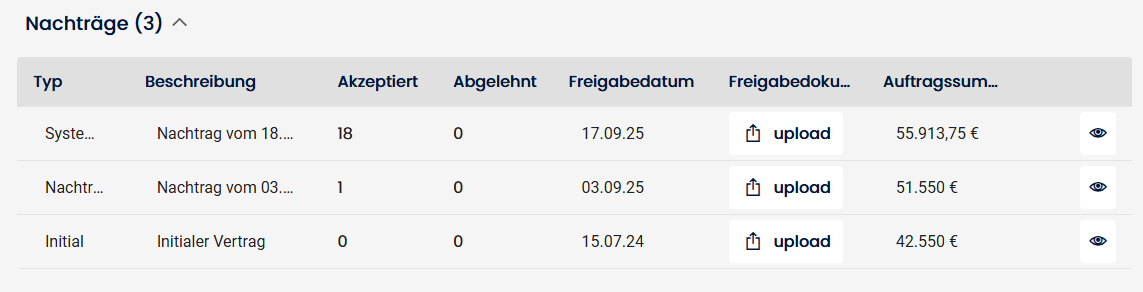 - Rechtssicherheit: Nutzen Sie die Spalte Freigabedokument, um unterzeichnete Nachträge hochzuladen oder zur Prüfung herunterzuladen. Dies stellt sicher, dass bei Audits oder Übergaben alle Dokumente an einem Ort verfügbar sind.