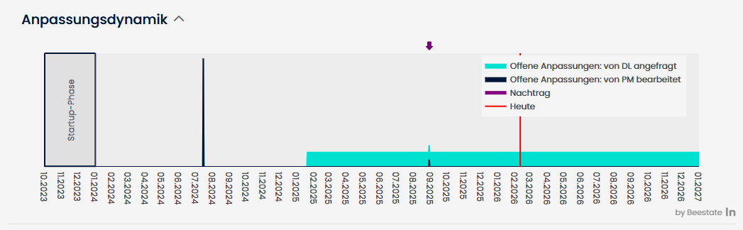 Ein "Living Contract" verändert sich ständig. Der klappbare Bereich Anpassungsdynamik macht diese Veränderungen über die gesamte Zeitachse sichtbar. Er dient als "Fieberkurve" des Vertrages und zeigt Ihnen: