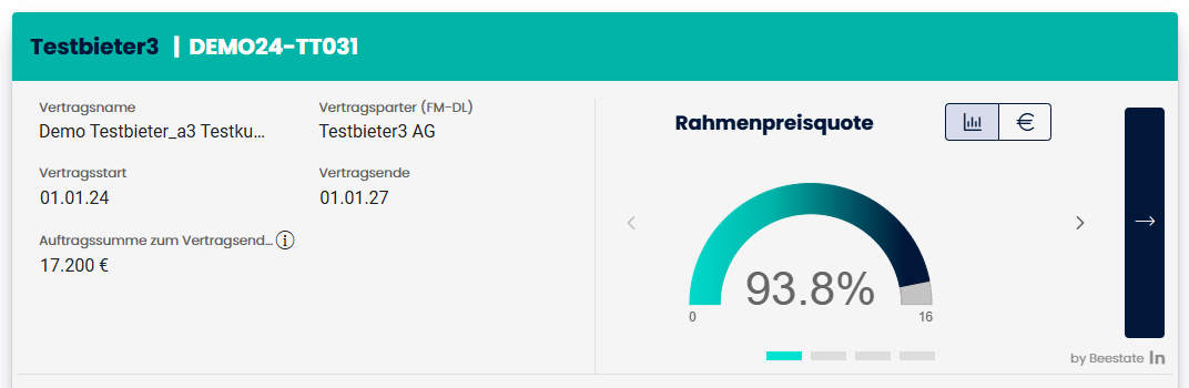 Direktzugriff (Navigation): Der markante Pfeil-Button rechts neben dem Karussell ist Ihr Sprungbrett in die Tiefe. Er führt Sie direkt zum Vertrags-Dashboard, von wo aus Sie das detaillierte Leistungsverzeichnis bearbeiten oder Dokumente im Dataroom verwalten können.