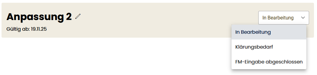 - Status-Dropdown: Ein Dropdown-Button zur Änderung des Bearbeitungsstatus mit folgenden Optionen (bei laufender Anpassung):