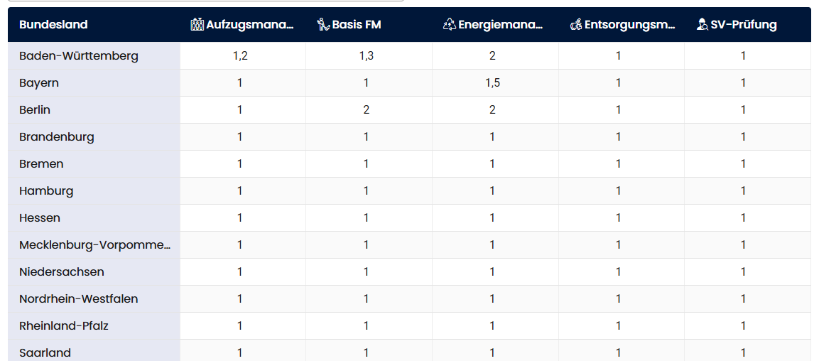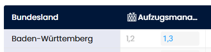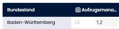 Die Tabelle der Bundeslandfaktoren ist wie folgt strukturiert: