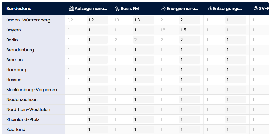 Regionalfaktoren ermöglichen es Ihnen, Preisanpassungen pauschal pro Bundesland vorzunehmen. Diese Faktoren werden auf die Basispreise angewendet und ermöglichen regionale Kostendifferenzierungen.