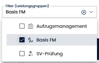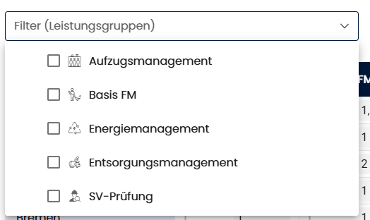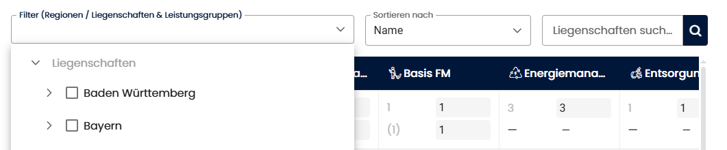 - Kombiniertes Filter-Dropdown: Ein Dropdown-Menü, das sowohl Regionen (Bundesländer, Städte), Liegenschaften als auch Leistungsgruppen zur Filterung enthält: