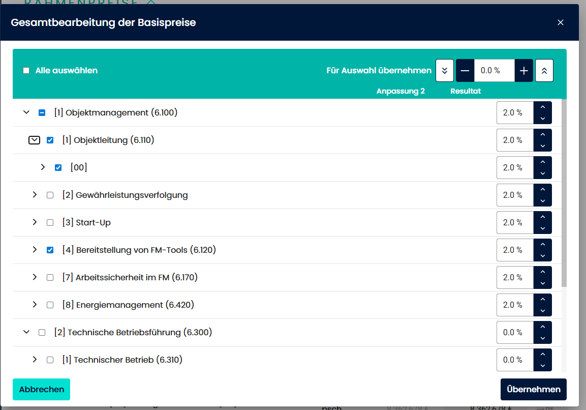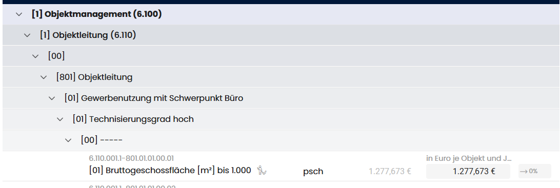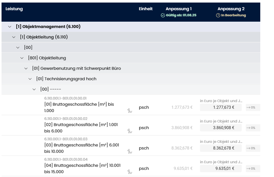 - Unterkategorien: Leistungsgruppen (z. B. "Objektleitung", "Objektverwaltung"), aufklappbar