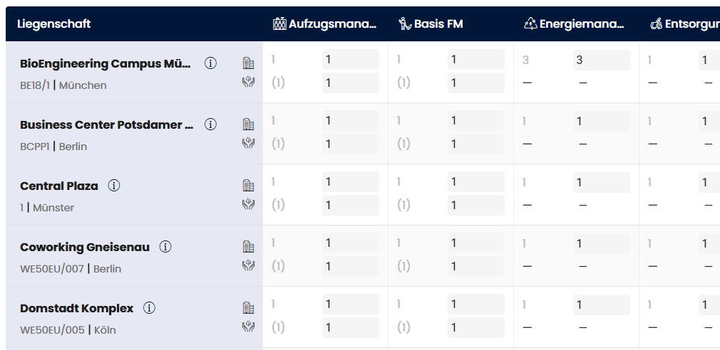 - Zeilen: Für jede Liegenschaft (Objekt im Portfolio) gibt es zwei Zeilen: